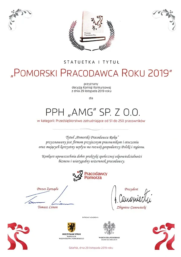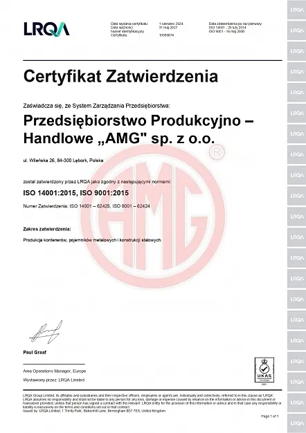 PPH AMG Sp. z o.o. posiada certyfikat Systemu Zarządzania Jakością ISO 9001:2015 oraz ISO 14001:2015 obejmujący „Produkcję kontenerów, pojemników metalowych i konstrukcji stalowych”. Po raz pierwszy certyfikat został nadany przedsiębiorstwu w maju 2000 roku. Jednostką certyfikującą był Lloyd’s Register Quality Assurance Limited. Przedsiębiorstwo posiada także certyfikat oraz uprawnienia nadane spawaczom przez DNV (Det Norske Veritas) do produkcji kontenerów na platformy wiertnicze typu Offshore.