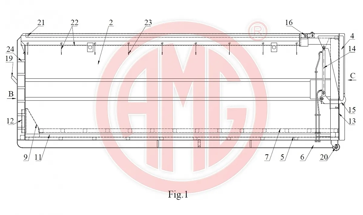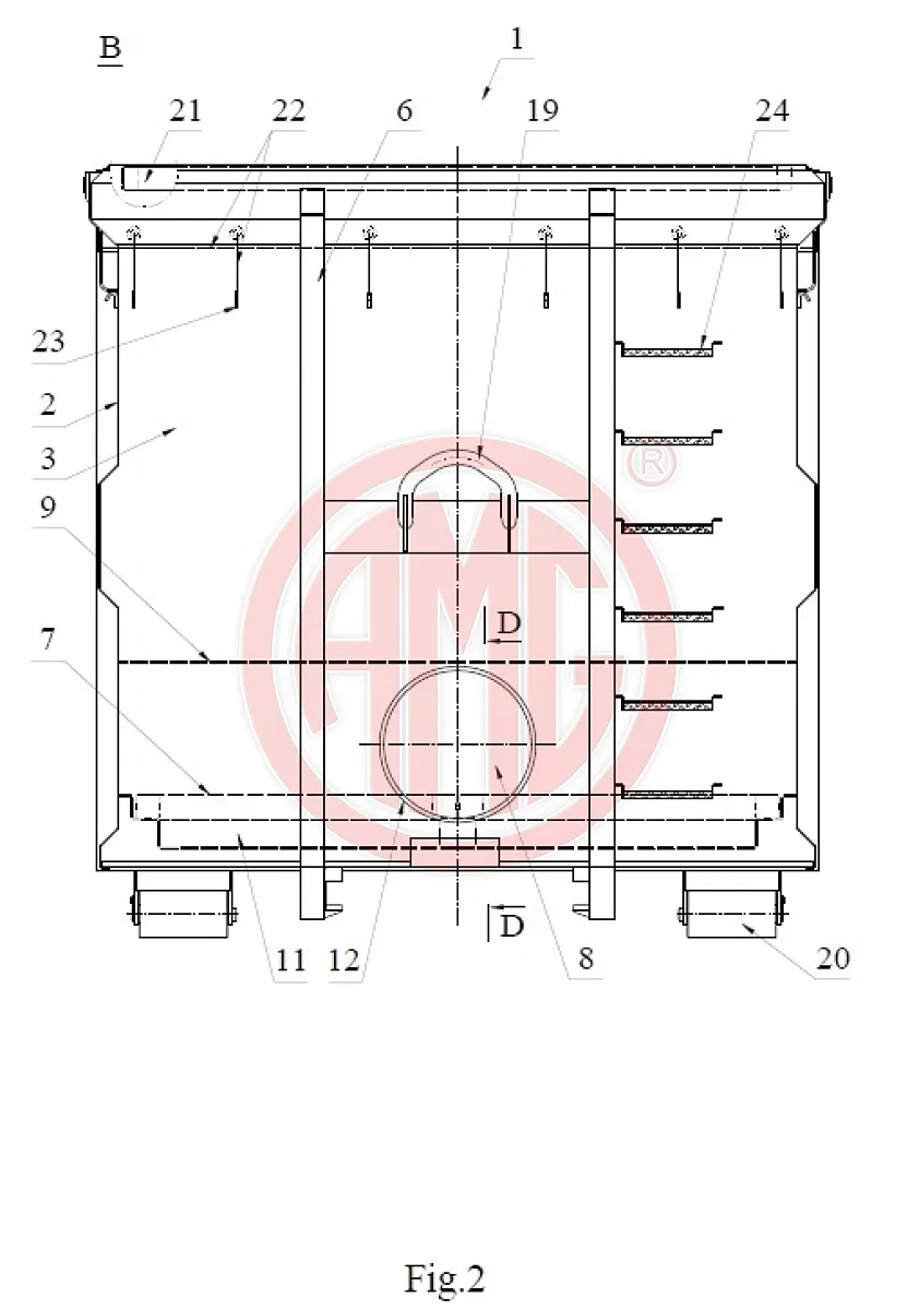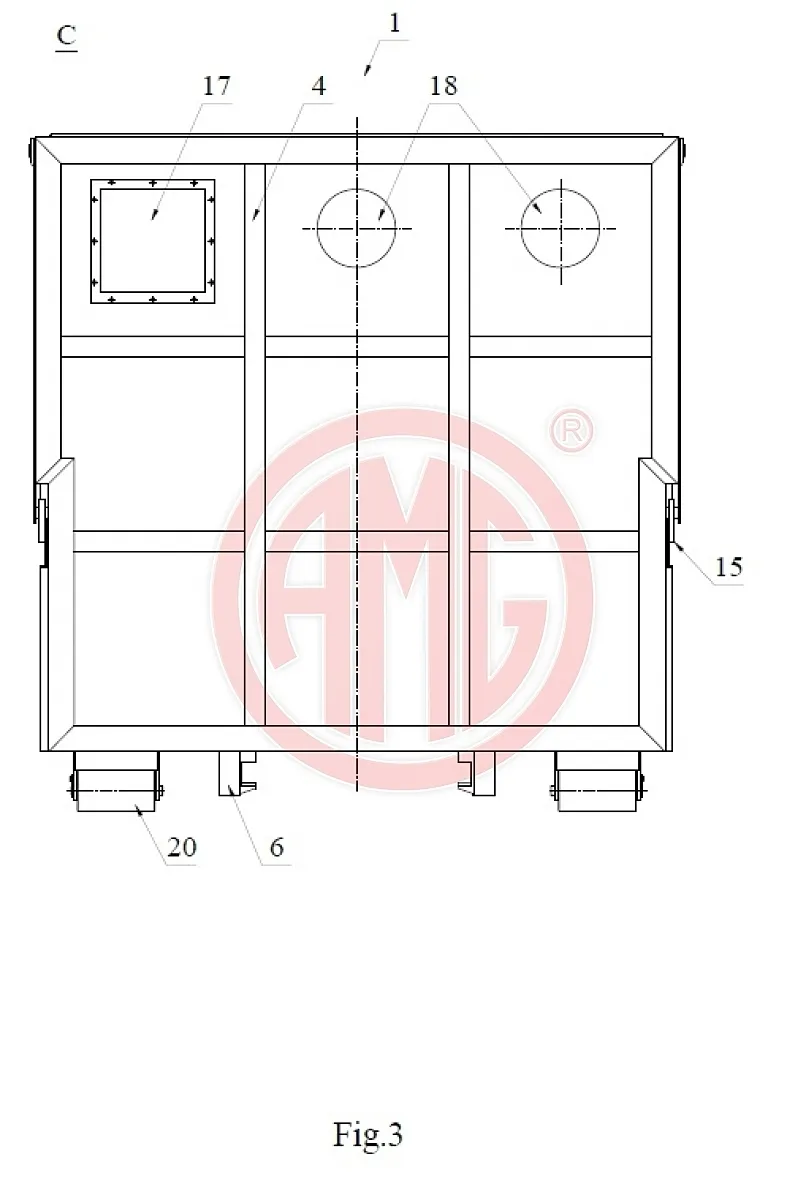 Te wszystkie zadania zrealizowane są w naszej konstrukcji przedstawionej na załączonych rysunkach. Sam kontener osadzony jest na ramie (6) samonośnej zgodnej z normą obowiązującą w kraju, w którym ten kontener będzie użytkowany. Z ramą ściśle związane są dwie rolki (20) używane w czynności załadowczo – wyładowczej oraz hak zaczepowy (19) przy pomocy którego można tego dokonać.