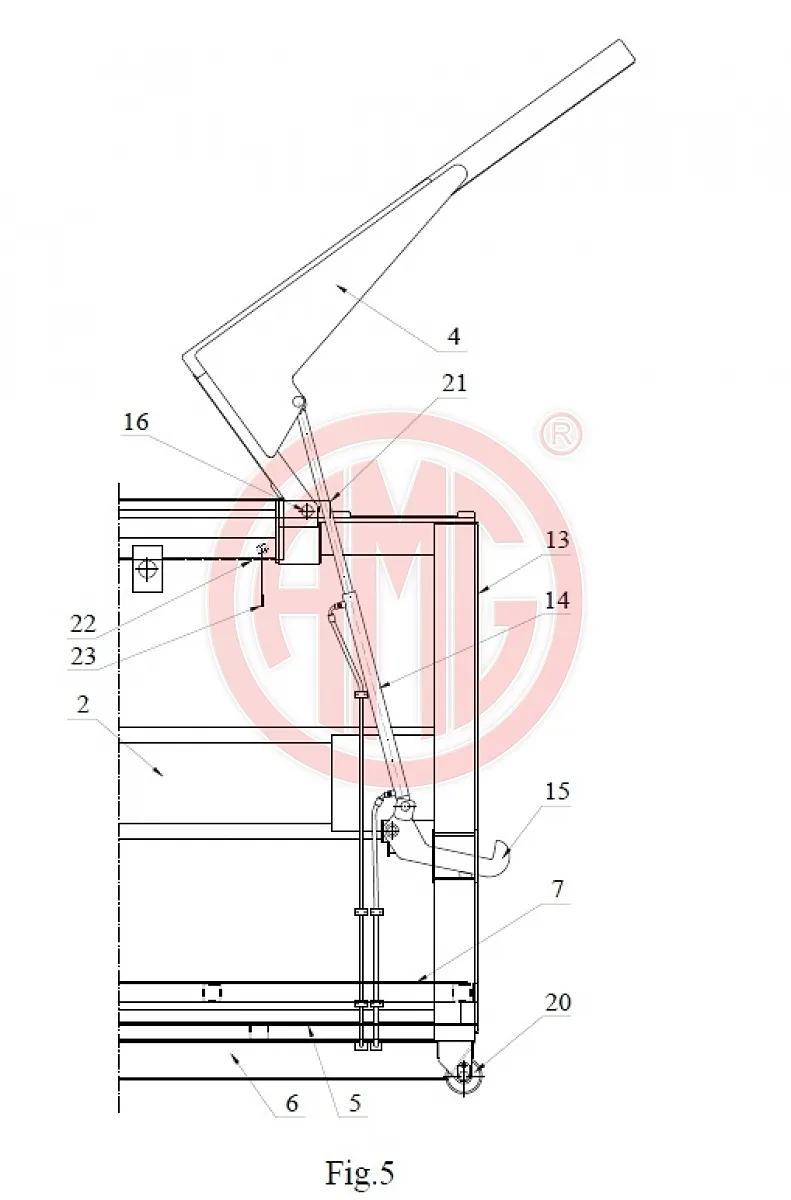 Siłowniki (14) powodują podnoszenie klapy (4) w celu otwarcia kontenera i umożliwienia jego opróżnienia z zawartości, a w cyklu zamykania powodują jego zamknięcie.